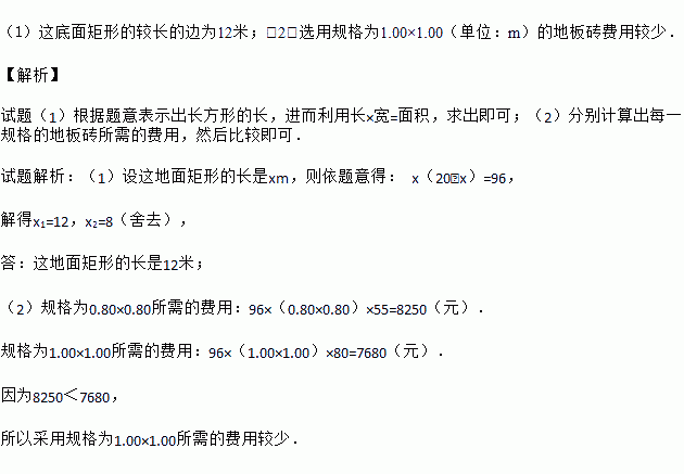 (2)有规格为0.80×0.80和1.00×1.00(单位:m)的地板砖单价分别为50元/块和80元/块,若只选其中一种地板砖都恰好能铺满储仓的矩形地面(不计缝隙),用哪一种规格的地板砖费用较少?