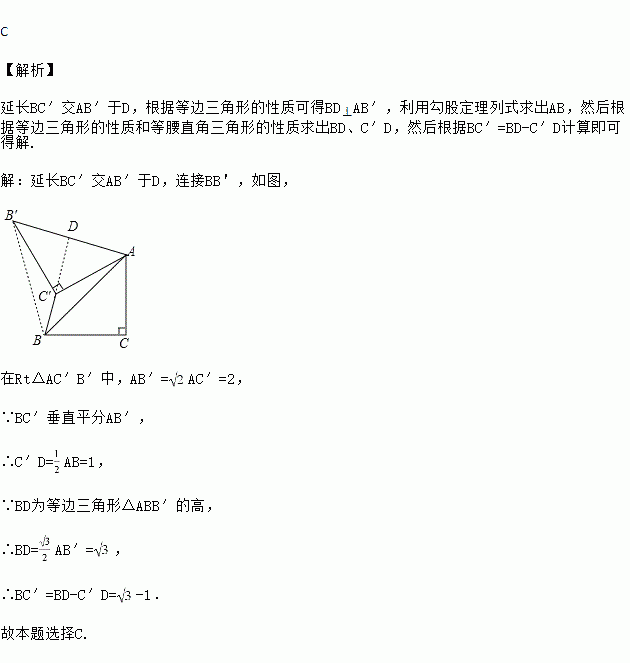 如图,已知△ABC中,∠C=90°,AC=BC=,将△ABC绕点A顺时针方向旋转60°到△AB′C′的位置,连接C′B,则C′B的长为( )