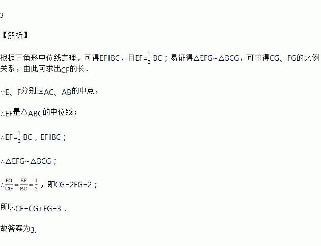 如图所示,已知点E,F分别是△ABC的边AC,AB的中点,BE,CF相交于点G,FG=1,则CF的长为____.