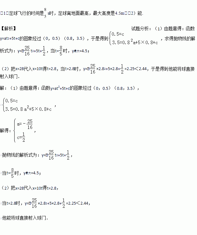 (2)若足球飞行的水平距离x(单位:m)与飞行时间t(单位:s)之间具有函数关系x=10t,已知球门的高度为2.44m,如果该运动员正对球门射门时,离球门的水平距离为28m,他能否将球直接射入球门?