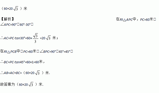 如图,小明同学在点P处测得教学楼A位于北偏东60°方向,办公楼B位于南偏东45°方向.小明沿正东方向前进60米到达C处,此时测得教学楼A恰好位于正北方向.办公楼B正好位于正南方向.求教学楼A与办公楼B之间的距离________.