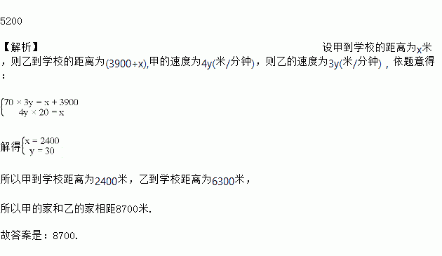 如图,甲和乙同时从学校放学,两人以各自送度匀速步行回家,甲的家在学校的正西方向,乙的家在学校的正东方向,乙家离学校的距离比甲家离学校的距离远3900米,甲准备一回家就开始做什业,打开书包时发现错拿了乙的练习册.于是立即步去追乙,终于在途中追上了乙并交还了练习册,然后再以先前的速度步行回家,(甲在家中耽搁和交还作业的时间忽略不计)结果甲比乙晚回到家中,如图是两人之间的距离y米与他们从学校出发的时间x分钟的函数关系图,则甲的家和乙的家相距_____米.