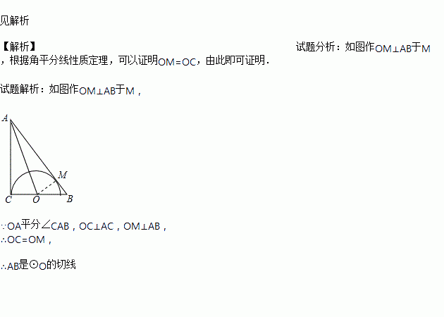 (2016·南充中考)如图,在Rt△ABC中,∠ACB=90°,∠BAC的平分线交BC于点O,OC=1,以点O为圆心、OC为半径作半圆.求证:AB为⊙O的切线.