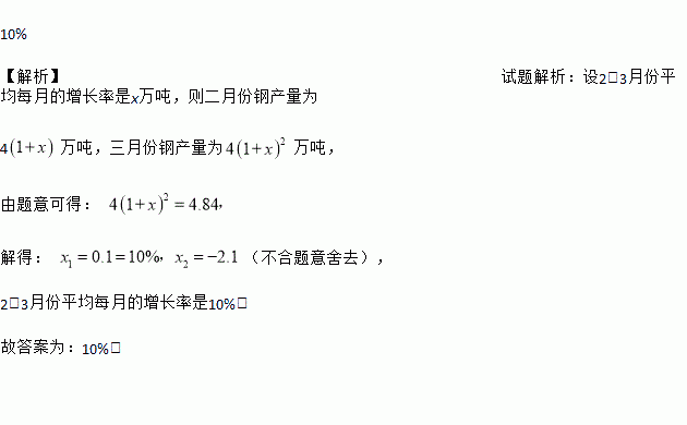 10% 【解析】试题解析:设2、3月份平均每月的增长率是x万吨,则二月份钢产量为 4万吨,三月份钢产量为万吨, 由题意可得: 解得: (不合题意舍去), 2、3月份平均每月的增长率是10%. 故答案为:10%.