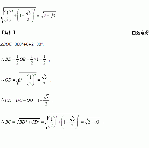 “割之弥细,所失弥少,割之又割,以至于不可割,则与圆周合体而无所失矣.”这是我国古代著名数学家刘徽在《九章算术注》中提到的“如何求圆的周长和面积”的方法,即“割圆术”.“割圆术”的主要意思是用圆内接正多边形去逐步逼近圆.刘徽从圆内接正六边形出发,将边数逐次加倍,并逐次得到正多边形的周长和面积.如图,AB是圆内接正六边形的一条边,半径OB=1,OC⊥AB于点D,则圆内接正十二边形的边BC的长是_________________(结果不取近似值).