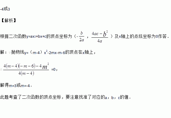 抛物线y=(m-4)x2-2mx-m-6的顶点在x轴上,则m=______.