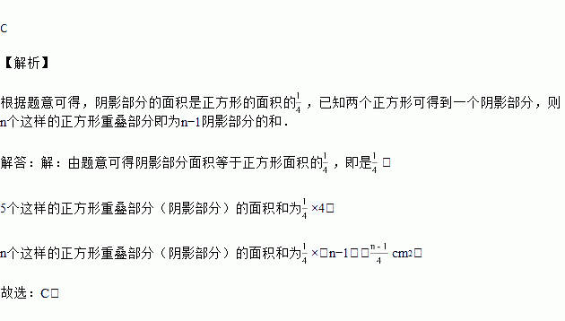 将n个边长都为1cm的正方形按如图所示的方法摆放,点A1,A2,…,An分别是正方形对角线的交点,则n个正方形重叠形成的重叠部分的面积和为( )