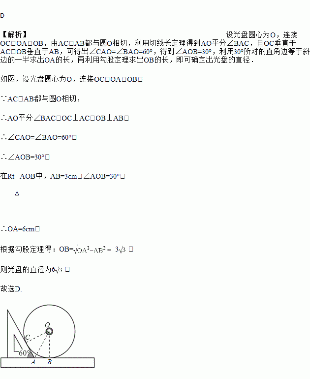 如图,一把直尺,的直角三角板和光盘如图摆放,为角与直尺交点,,则光盘的直径是( )
