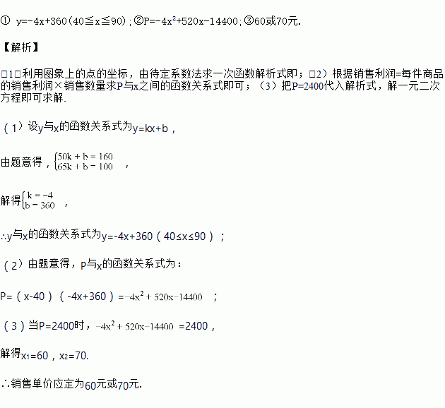 某商场老板对一种新上市商品的销售情况进行记录,已知这种商品进价为每件40元,经过记录分析发现,当销售单价在40元至90元之间(含40元和90元)时,每月的销售量y(件)与销售单价x(元)之间的关系可近似地看作一次函数,其图象如图所示.