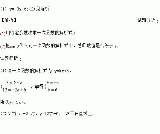 (1) y=-3x+6;(2)见解析. 【解析】试题分析: (1)用待定系数法求一次函数的解析式; (2)把x=-2代入到一次函数的解析式中,看函数值是否等于-6. 试题解析: (1)设一次函数的解析式为 y=kx+b, ,解得 所以y=-3x+6 (2)∵当 x=-2 时,y=12≠-6,∴P不在直线上.