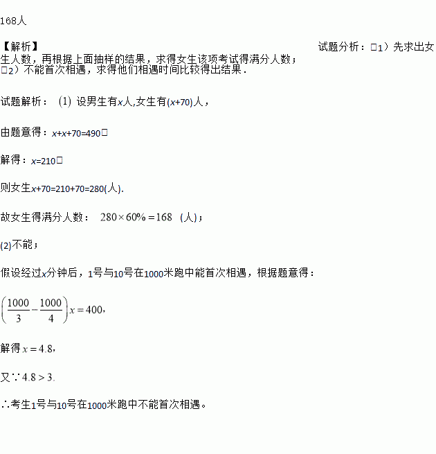 (1) 按规定,女生跑 800 米的时间不超过 3'24"就可以得满分.该校九年级学生有 490 人,男生比女生少 70 人.请你根据上面成绩,估计该校女生中有多少人该项测试成绩得满分?