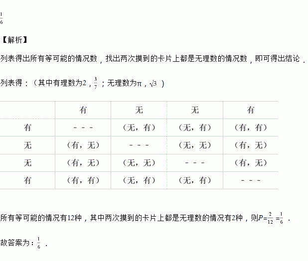四个实数,先随机的抽出一张卡片,不放回,再随机的抽出一张卡片,则两次抽到的卡片上都是无理数的概率是______.