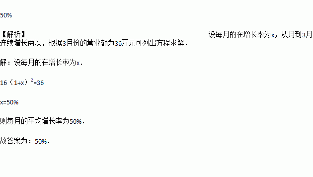 “惠农”超市1月份的营业额为16万元,3月份的营业额为36万元,则每月的平均增长率为 。
