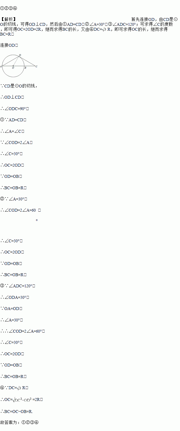 如图所示,D是半径为R的⊙O上一点,过点D作⊙O的切线交直径AB的延长线于点C,下列四个条件:①AD=CD;②∠A=30°;③∠ADC=120°;④DC=