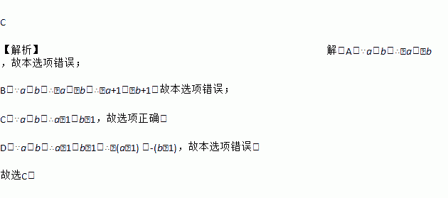 C 【解析】解:A.∵a>b,∴﹣a<﹣b,故本选项错误; B.∵a>b,∴﹣a<﹣b,∴﹣a+1<﹣b+1,故本选项错误; C.∵a>b,∴a﹣1>b﹣1,故选项正确; D.∵a>b,∴a﹣1>b﹣1,∴﹣(a﹣1) <-(b﹣1),故本选项错误. 故选C.