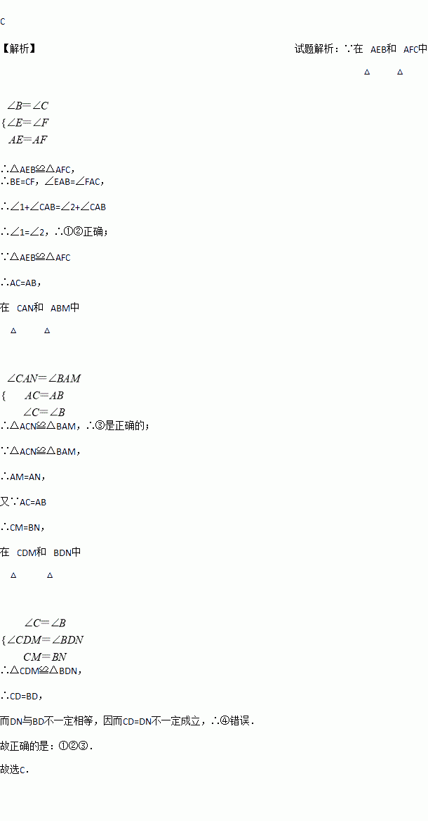 ①∠1=∠2;②BE=CF;③△CAN≌△ABM;④CD=DN其中正确的结论是( )