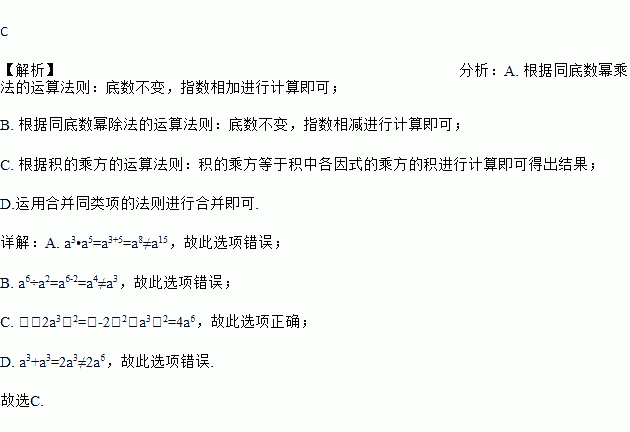 A. a3•a5=a15 B. a6÷a2=a3 C. (﹣2a3)2=4a6 D. a3+a3=2a6