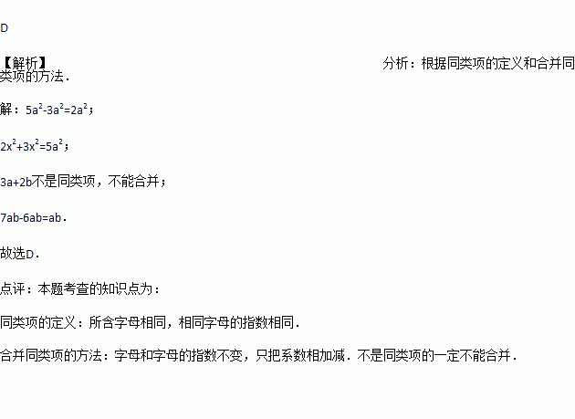 A. 5a2﹣3a2=2 B. 2x2+3x2=5x4 C. 3a+2b=5ab D. 7ab﹣6ba=ab
