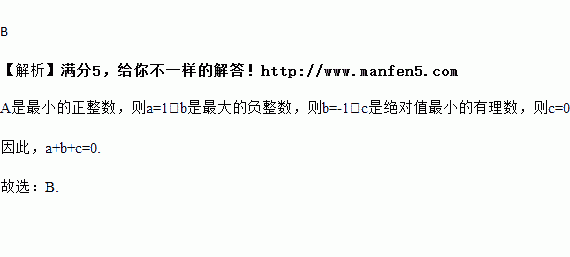 在CCTV“开心辞典”栏目中,主持人问这样一道题目:“a是最小的正整数,b是最大的负整数,c是绝对值最小的有理数,请问:a,b,c三数之和是”( )