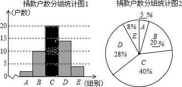 在一次“献爱心手拉手”捐款活动中,某数学兴趣小组对学校所在社区部分捐款户数进行调查和分组统计,将数据整理成以下统计表和统计图(信息不完整),已知A、B两组捐款户数的比为1:5