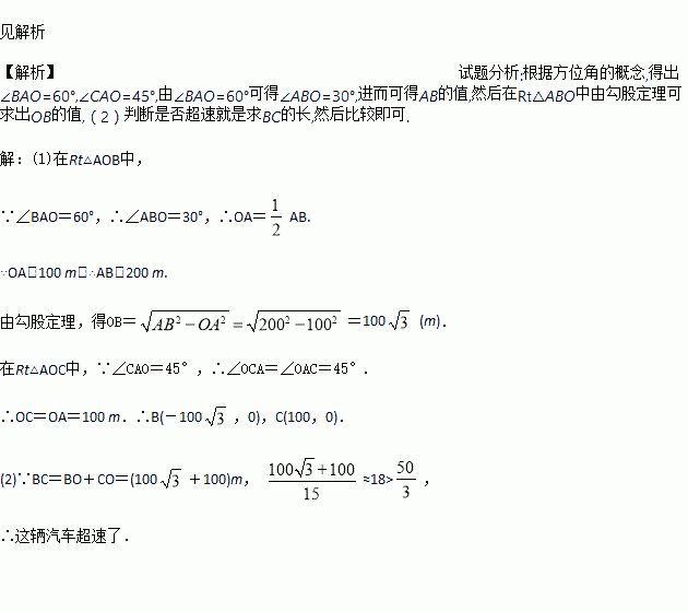 £©£¬²¢ÔÚÀë¸Ã¹«Â·100 m´¦ÉèÖÃÁËÒ»¸ö¼à²âµãA.ÔÚÈçͼµÄÆ½ÃæÖ±½Ç×ø±êϵÖУ¬µãAλÓÚyÖáÉÏ£¬²âËÙ·¶ÎBCÔÚxÖáÉÏ£¬µãBÔÚµãAµÄ±±Æ«Î÷60¡ã·½ÏòÉÏ£¬µãCÔÚµãAµÄ±±Æ«¶«45¡ã·½ÏòÉÏ£®ÁíÍâÒ»Ìõ¹«Â·ÔÚyÖáÉÏ£¬AOΪÆäÖеÄÒ»¶Î£®