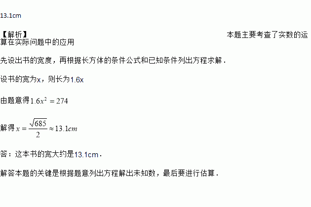 一本书长是宽的1.6倍,面积为274平方厘米,则这本书的宽大约是多少?(精确到0.1cm)