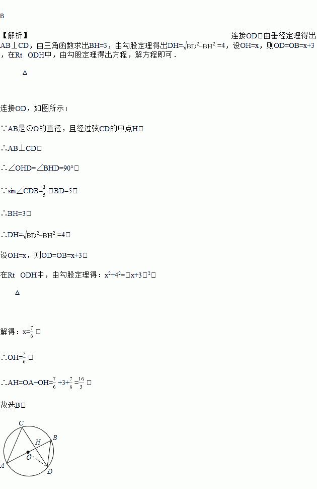 如图,AB是⊙O的直径,且经过弦CD的中点H,已知sin∠CDB=,BD=5,则AH的长为( )
