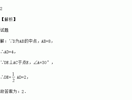 如图,在Rt△ABC中,∠C=90°,D为AB的中点,DE⊥AC于点E.∠A=30°,AB=8,则DE的长度是 .