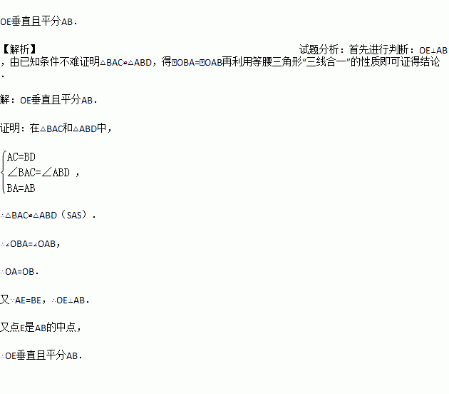 如图所示,∠BAC=∠ABD,AC=BD,点O是AD、BC的交点,点E是AB的中点.试判断OE和AB的位置关系,并给出证明.