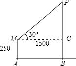 ∴MP高度差为:PC=1500×tan30°=866(m).