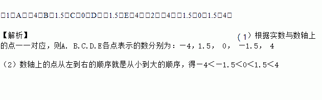 (1)A:﹣4;B:1.5;C:0;D:﹣1.5;E:4;(2)﹣4<﹣1.5<0<1.5<4. 【解析】(1)根据实数与数轴上的点一一对应,则A. B.C.D.E各点表示的数分别为:—4,1.5, 0, —1.5, 4 (2)数轴上的点从左到右的顺序就是从小到大的顺序,得—4<—1.5<0<1.5<4