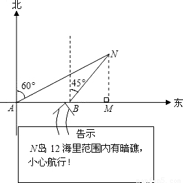 “航天”号轮船以20海里/时的速度向正东方向航行,当轮船到达A处时,测得N岛在北偏东60°的方向上,继续航行30分钟到达B处,发现一块告示牌(见图),测得N岛在北偏东45°的方向上,若轮船继续向正东方向航行,有无触礁危险?简述理由.