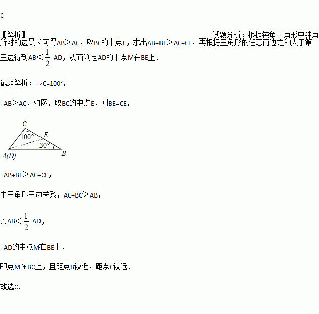如图1,M是铁丝AD的中点,将该铁丝首尾相接折成△ABC,且∠B=30°,∠C=100°,如图2.则下列说法正确的是( )