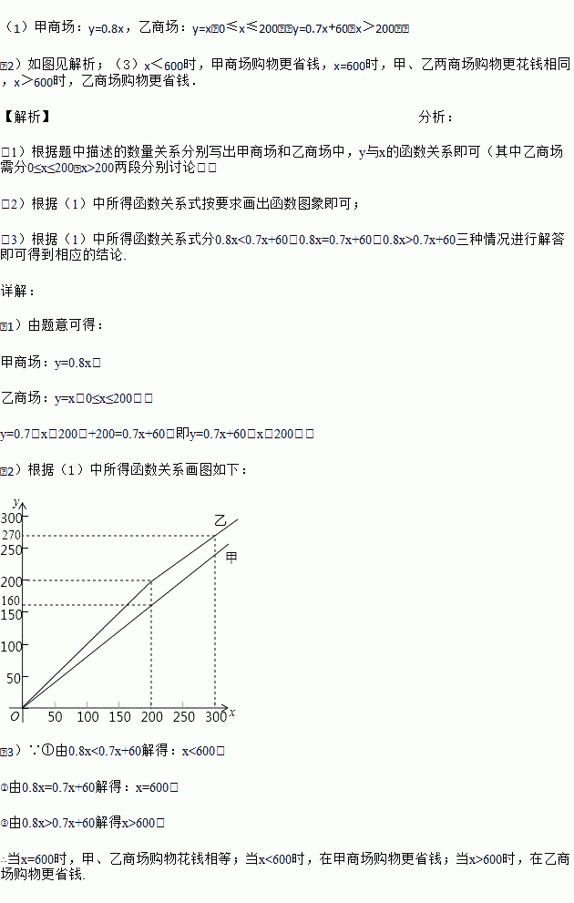 甲、乙两家商场平时以同样价格出售相同的商品,春节期间两家商场都让利酬宾,其中甲商场所有商品按8折出售,乙商场对一次购物中超过200元后的价格部分打7折.