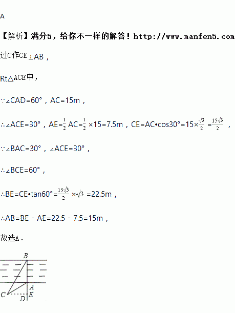 如图,小明为了测量河宽AB,先在BA延长线上取一点D,再在同岸取一点C,测得∠CAD=60°,∠BCA=30°,AC=15 m,那么河AB宽为( )
