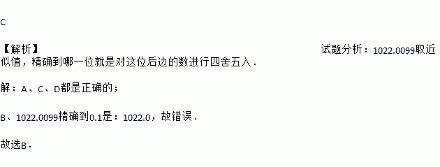 C 【解析】试题分析:1022.0099取近似值,精确到哪一位就是对这位后边的数进行四舍五入. 【解析】 A、C、D都是正确的; B、1022.0099精确到0.1是:1022.0,故错误. 故选B.