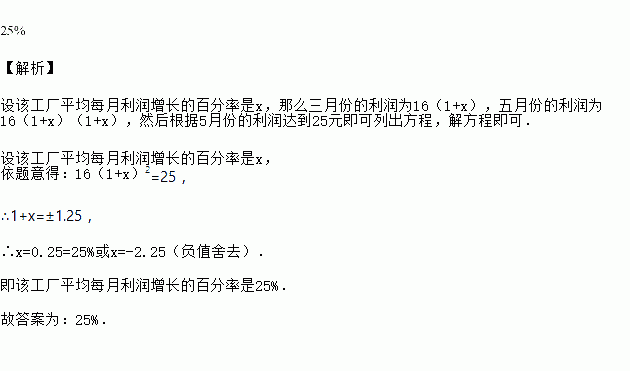 某工厂三月份的利润为16万元,五月份的利润为25万元,则平均每月增长的百分率为______.