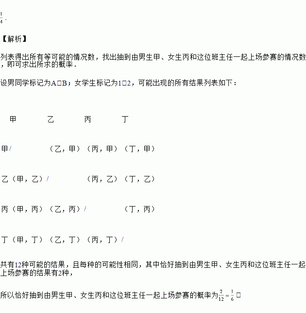 某校组织一项公益知识竞赛,比赛规定:每个班级由2名男生、2名女生及1名班主任老师组成代表队.但参赛时,每班只能有3名队员上场参赛,班主任老师必须参加,另外2名队员分别在2名男生和2名女生中各随机抽出1名.初三(1)班由甲、乙2名男生和丙、丁2名女生及1名班主任组成了代表队,求恰好抽到由男生甲、女生丙和这位班主任一起上场参赛的概率.(请用“画树状图”或“列表”或“列举”等方法给出分析过程)