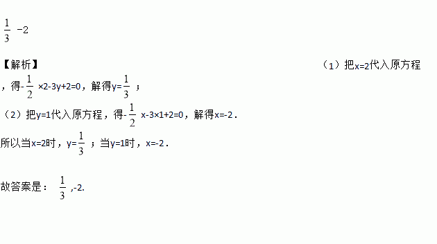 在二元一次方程﹣ x﹣3y+2=0中,当x=2时,y=________;当y=1时,x=________.