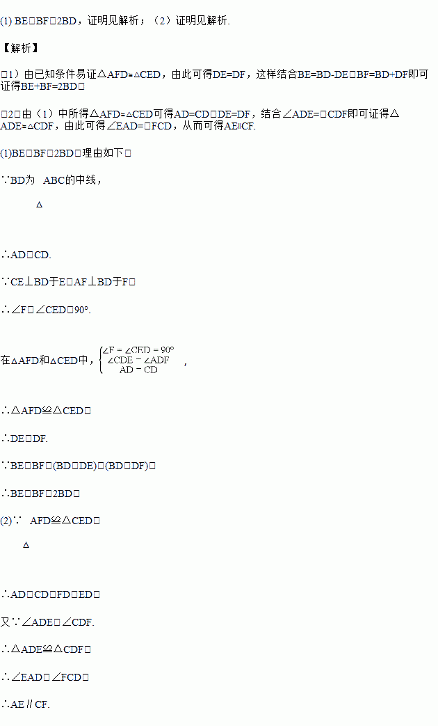 如图所示,BD是△ABC的中线,CE⊥BD于点E,AF⊥BD,交BD的延长线于点F.