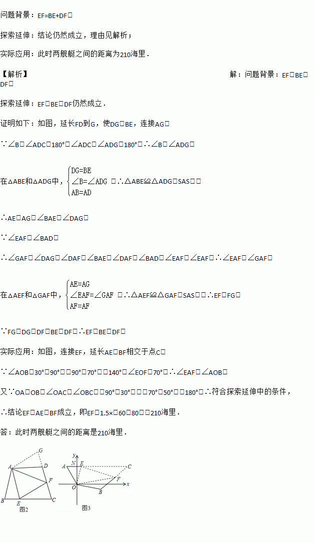 问题背景:EF=BE+DF; 探索延伸:结论仍然成立,理由见解析; 实际应用:此时两舰艇之间的距离为210海里. 【解析】【解析】 问题背景:EF=BE+DF; 探索延伸:EF=BE+DF仍然成立. 证明如下:如图,延长FD到G,使DG=BE,连接AG, ∵∠B+∠ADC=180°,∠ADC+∠ADG=180°,∴∠B=∠ADG, 在△ABE和△ADG中...