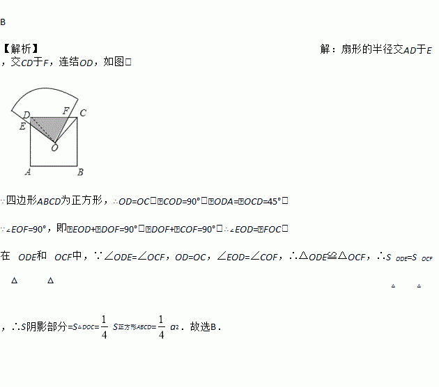 如图,O是边长为a的正方形ABCD的中心,将一块半径足够长、圆心为直角的扇形纸板的圆心放在O点处,并将纸板的圆心绕O旋转,则正方形ABCD被纸板覆盖部分的面积为( )