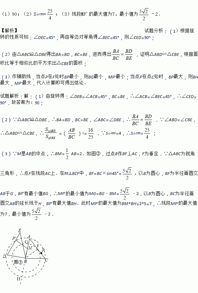 (3)点M为线段AB的中点,点P是线段AC上一动点,在△ABC绕点B按逆时针方向旋转过程中,点P的对应点P′,连接MP′,如图③,直接写出线段MP′长度的最大值和最小值.