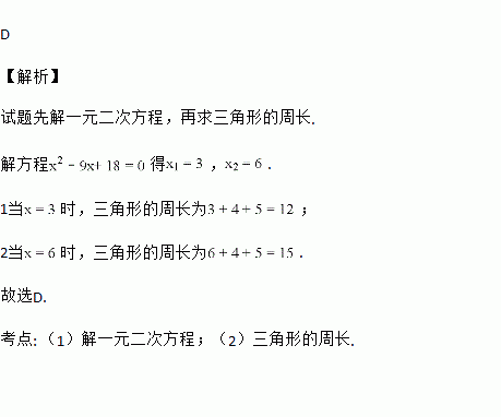 )一个三角形的两边长为4和5,第三边的长是方程x2﹣9x+18=0的一个根,则这个三角形的周长为( )