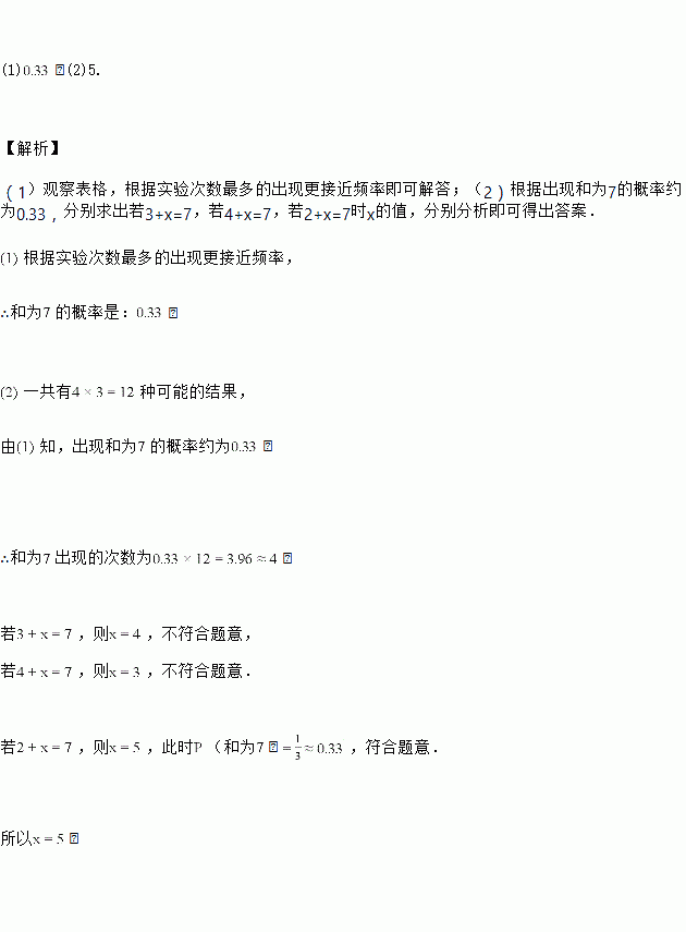 个小球上数字之和,记录后将小球放回袋中搅匀,进行重复实验.实验数据如下表:![]()