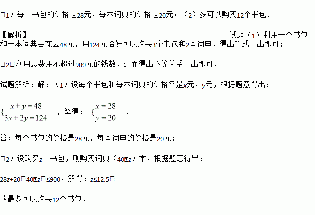 (2)学校计划总费用不超过900元,为获胜的40名同学颁发奖品(每人一个书包或一本词典),求最多可以购买多少个书包?