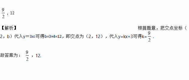 若函数y=3x2的图象与直线y=kx+3的交点为(2,b),则k=_____,b=______.