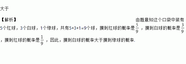 一个口袋中装有5个红球,3个白球,1个绿球,摸到白球的频率______摸到绿球的频率(填“大于”“小于”或“等于”)
