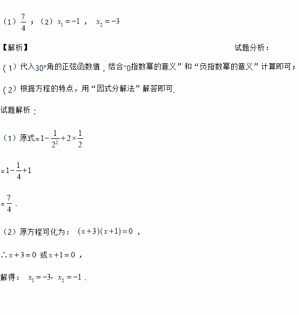(1)计算: ; (2) 解方程:x2+4x+3=0.
