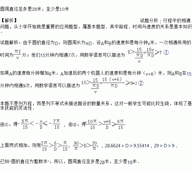 如图,A和B两个小机器人,自甲处同时出发相背而行,绕直径为整数米的圆周上运动,15分钟内相遇7次,如果A的速度每分钟增加6米,则A和B在15分钟内相遇9次,问圆周直径至多是多少米?至少是多少米?(取π=3.14)